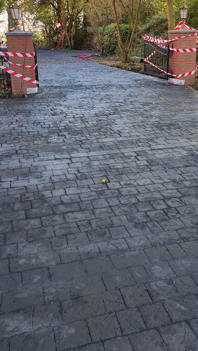 Er zijn veel mogelijkheden in uitstraling. Denk aan cobblestone, klinkers, natuursteen of flagstone. Ook de kleur bepalen we samen. Op de foto hierboven is gekozen voor het cobblestone patroon in antraciet, een populaire combinatie die zowel klassiek als modern werkt.
